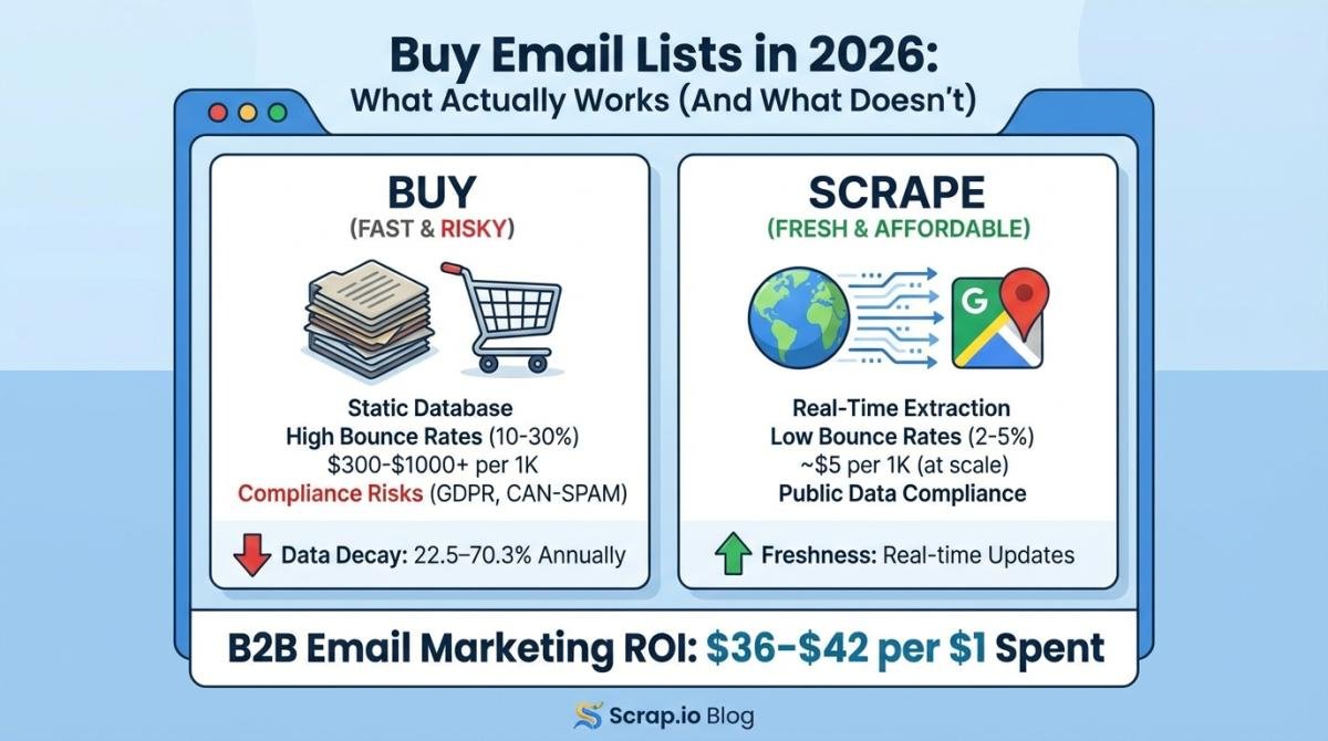 So should you still buy email lists? Honestly? It depends. And I know that's annoying to hear. But stick with me through this guide and you'll actually know what makes sense for your situation. The real costs. The real risks. The providers worth considering. And a scraping alternative that a lot of smart teams are quietly switching to in 2026.