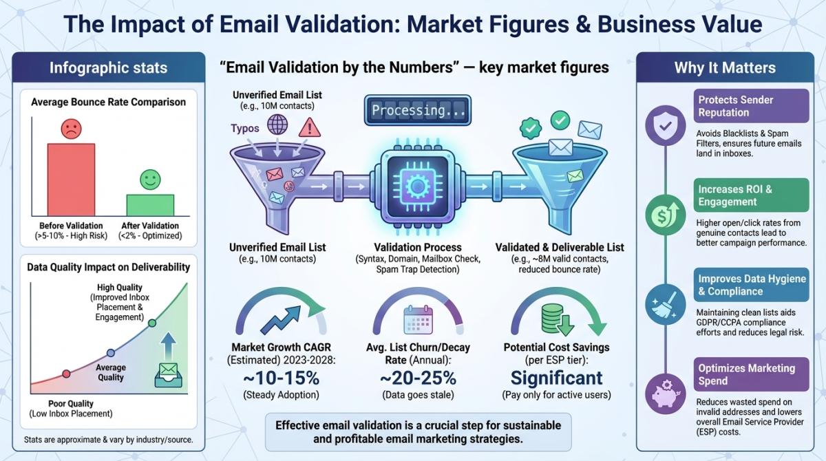 Here's a scenario that plays out all the time. A small agency runs Google Ads into a landing page with an email capture. List grows to 5,000 contacts over a few months. Nobody validates anything. When they finally run the list through a checker? 22% comes back invalid. They'd been paying their ESP for every one of those ghost addresses. (If you've ever bought email lists, you know this gets even worse — purchased lists routinely have 30-40% bad addresses.)