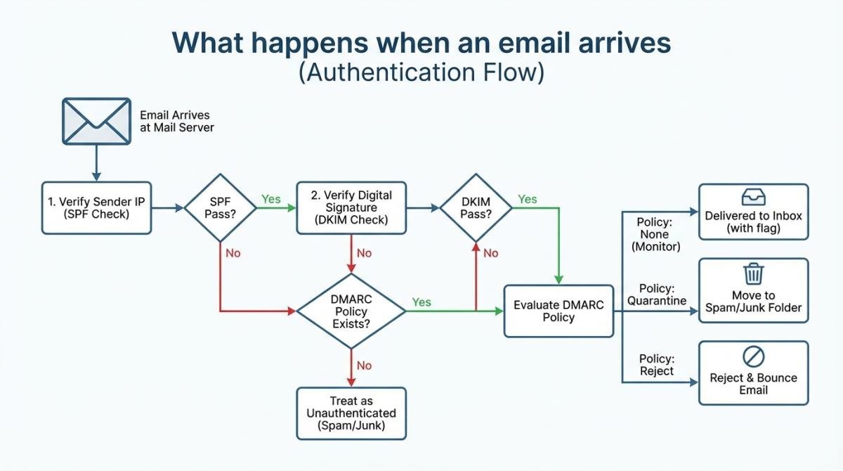 DMARC sits on top of SPF and DKIM. It tells receiving servers: "Here's what to do when something fails."