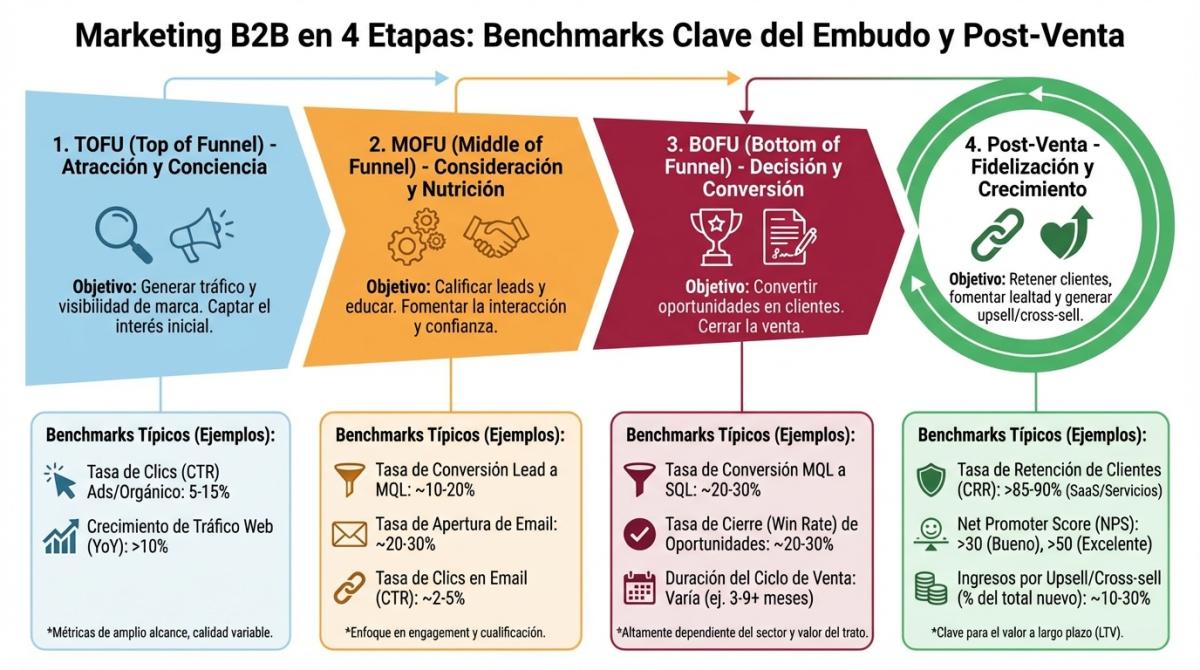 Si no mides, no sabes. Y si no sabes, estás adivinando. En B2B, adivinar cuesta caro. Estos son los benchmarks de referencia para 2026.