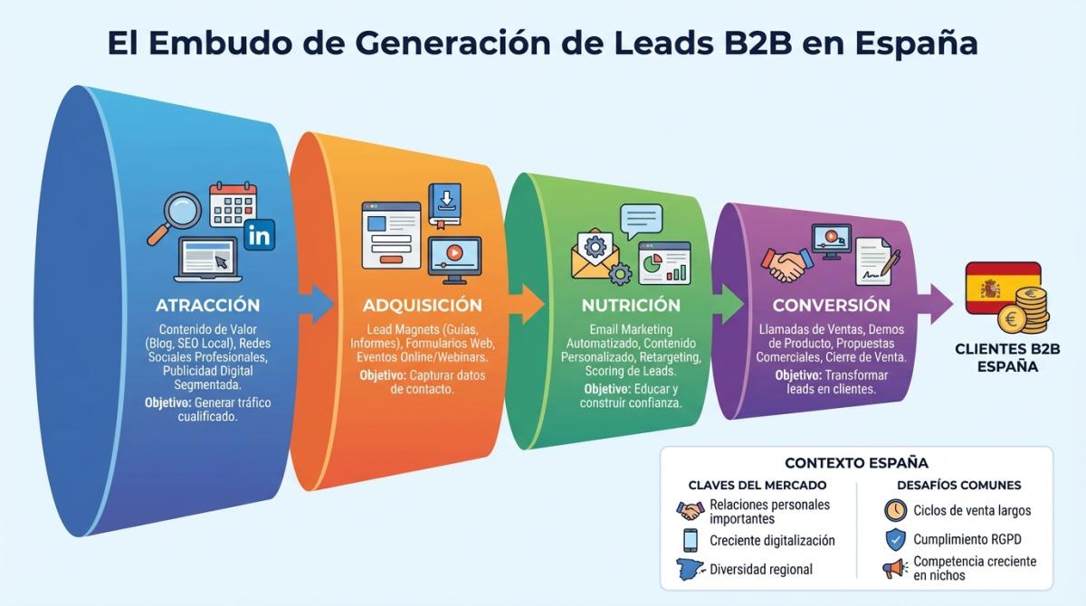 El embudo: atraer → capturar → nutrir → convertir. Simple en teoría. En la práctica, la mayoría de empresas españolas se atoran en el primero. Sin generación de leads constante, no hay pipeline de ventas y los ingresos dependen de que suene el teléfono. Eso no escala.