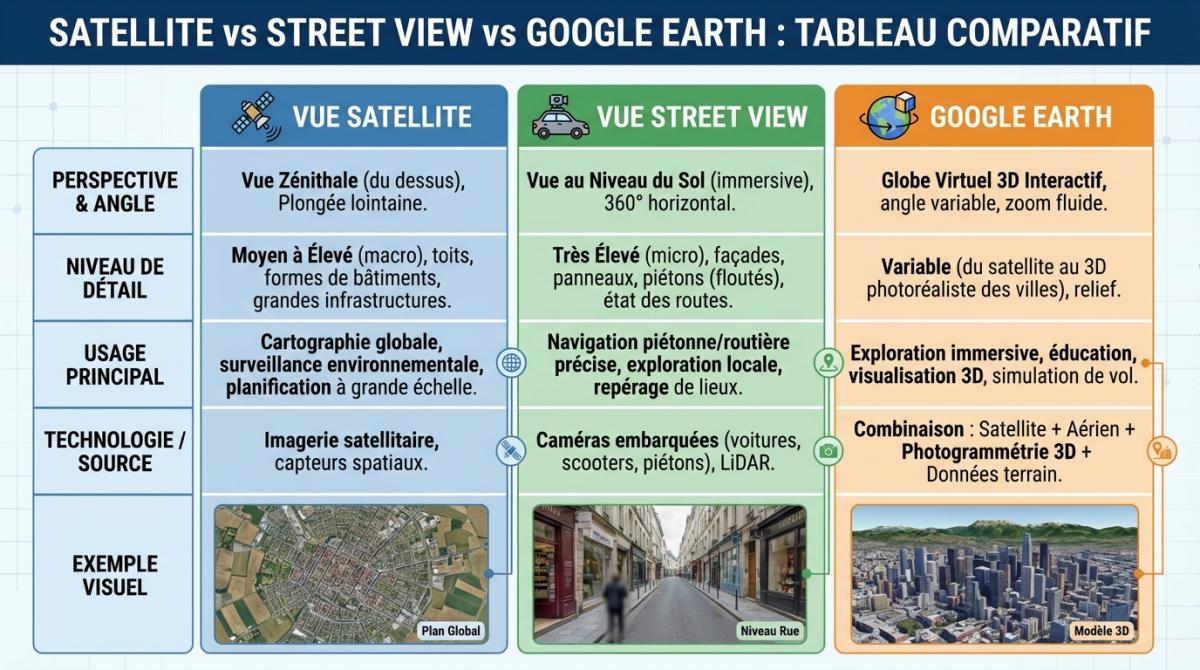 Google Maps, c'est la navigation, les fiches d'entreprises, Street View. Google Earth, c'est l'exploration 3D, les images historiques (Timelapse), l'analyse géographique.