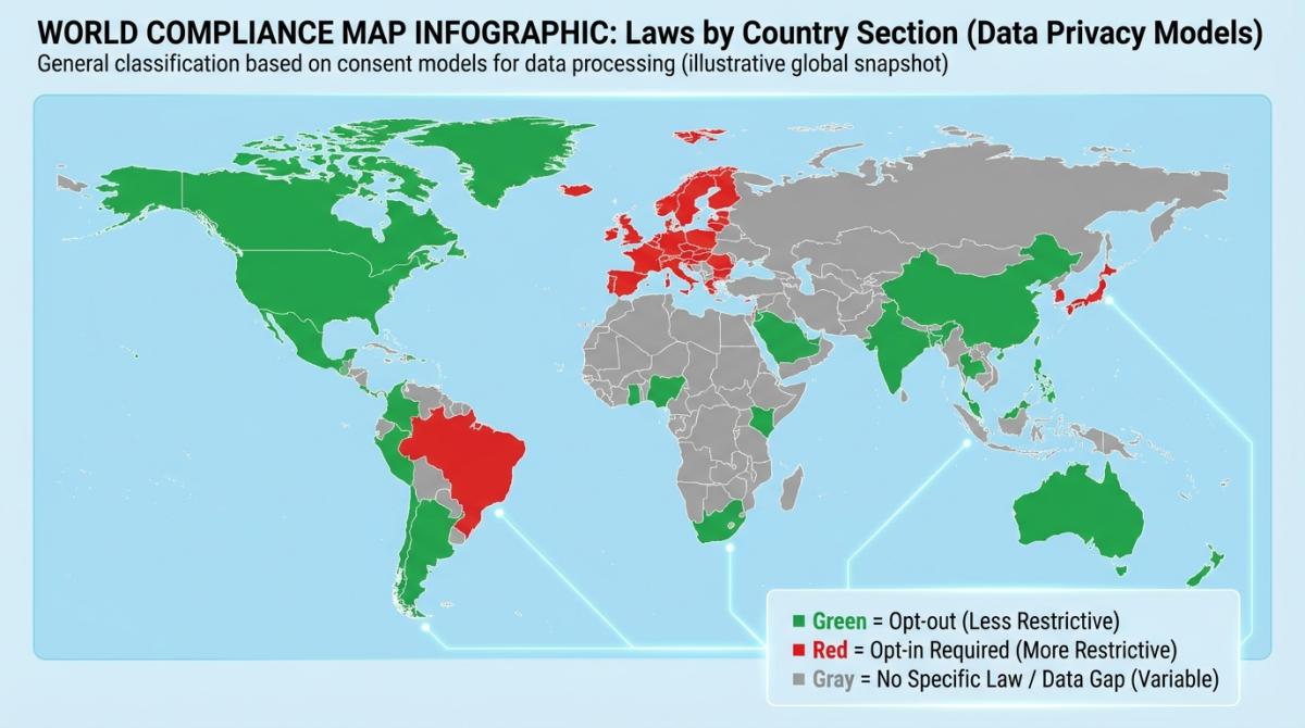 OK so this is the section where things get genuinely confusing, because every country decided to write their own rules. An email that's perfectly legal when you send it from Miami to Chicago could get you a formal complaint if the recipient happens to be in Toronto. Not hypothetically — I've seen it happen.