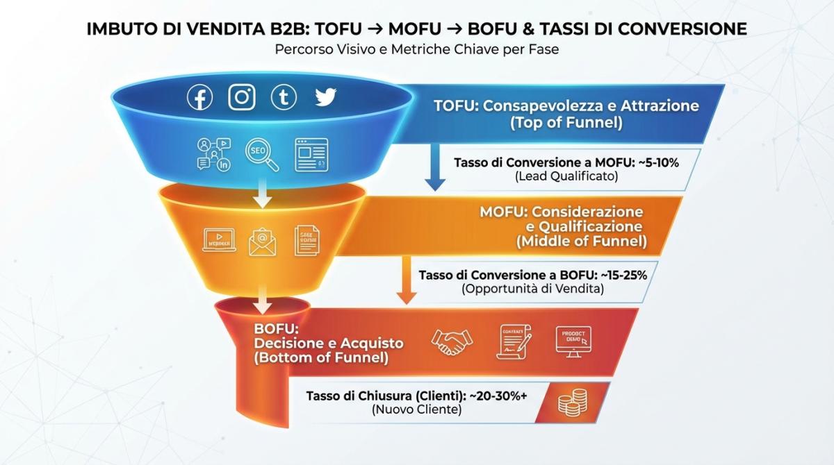 Ecco. Questo è esattamente il problema che un funnel di vendita B2B risolve. E no, non è un concetto astratto da manuale di marketing americano. È una cosa concreta, misurabile, che nel 2026 fa la differenza tra aziende che crescono e aziende che restano ferme.