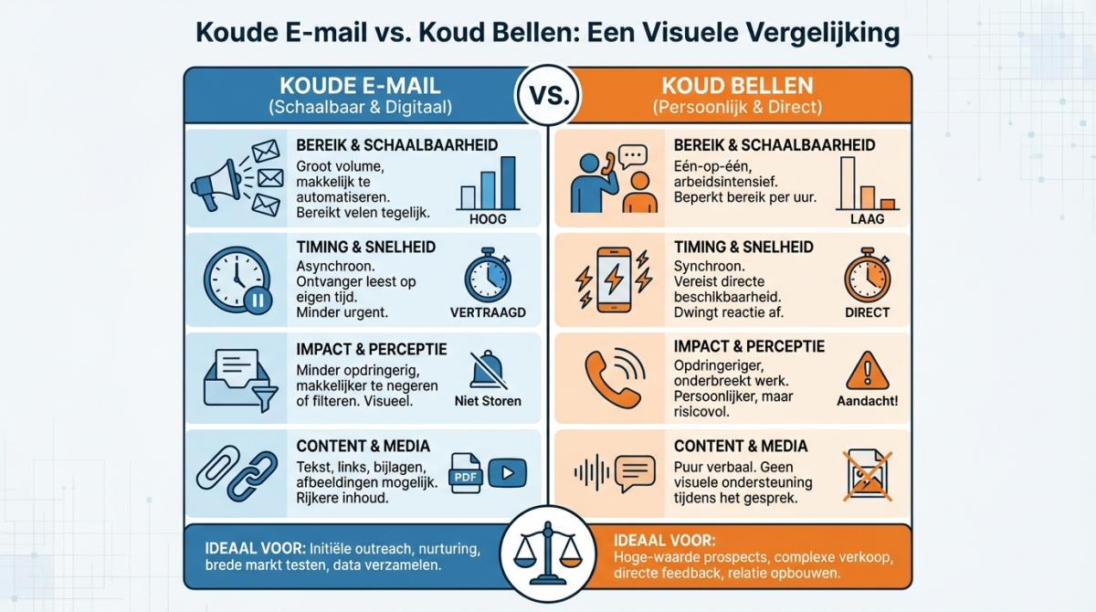 Cold email heeft een gemiddelde reply rate van 8,5% tegenover circa 2% conversie bij cold calling. E-mail is schaalbaarder (200 tot 500+ contacten per dag versus 30 à 50 via telefoon), goedkoper per lead (€0,10–0,50 versus €5–25) en minder intrusief. Het sterkste resultaat haal je door beide kanalen te combineren.