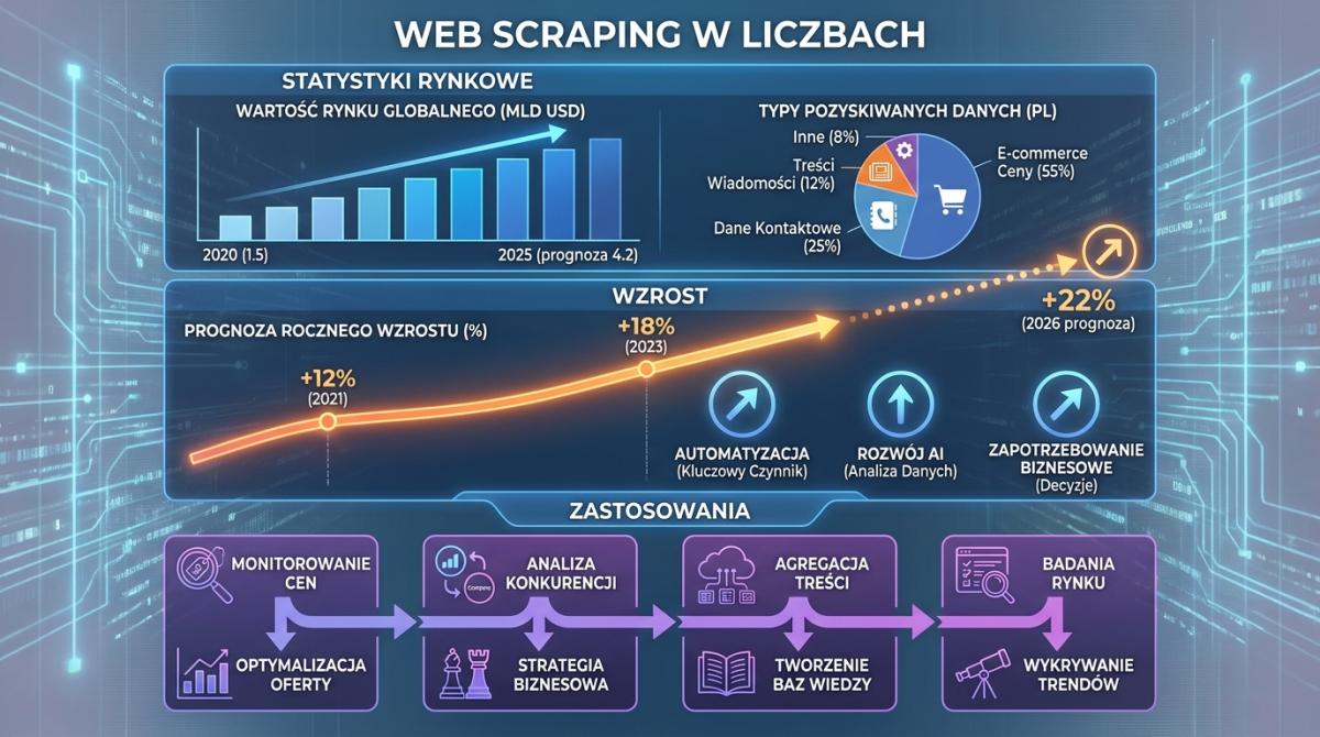 Agregowanie ofert nieruchomości z kilkudziesięciu portali jednocześnie? Scraping. Śledzenie kursów walut i cen akcji w czasie rzeczywistym? Też scraping. A szerzej patrząc na polski rynek cyfrowy — z wartością e-commerce przekraczającą 20 miliardów dolarów — potencjał dla automatyzacji zbierania danych jest naprawdę spory.