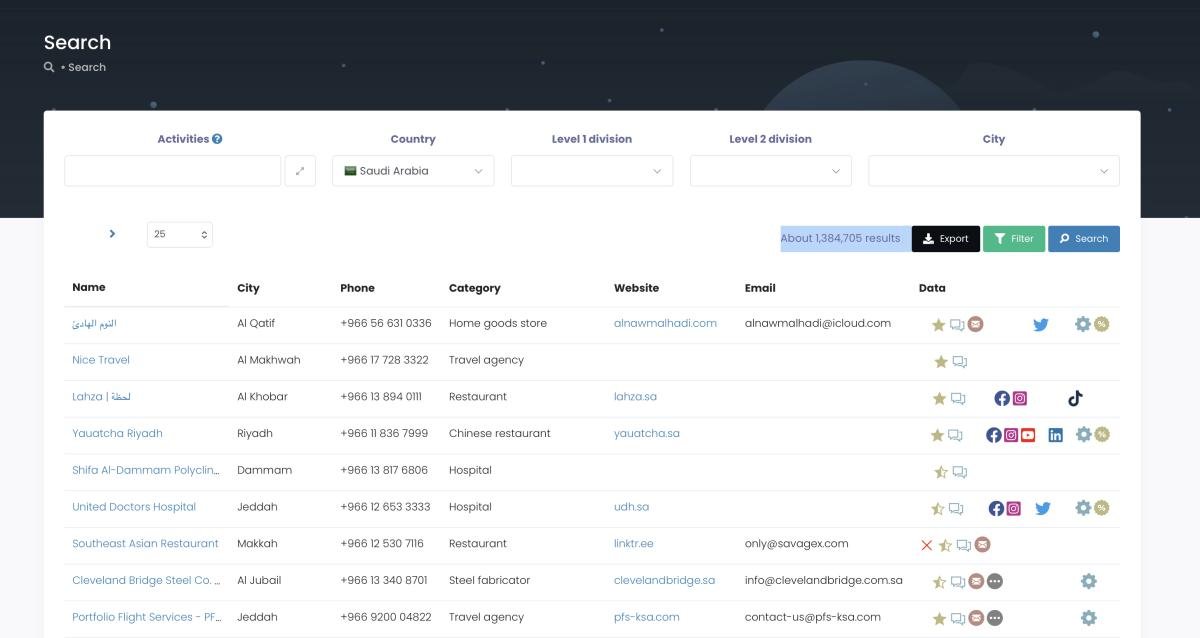 Alright let's talk specifics. Scrap.io currently has 1,384,705Β establishments indexed across Saudi Arabia. All of it extracted in real time from Google Maps and the websites associated with each business listing.