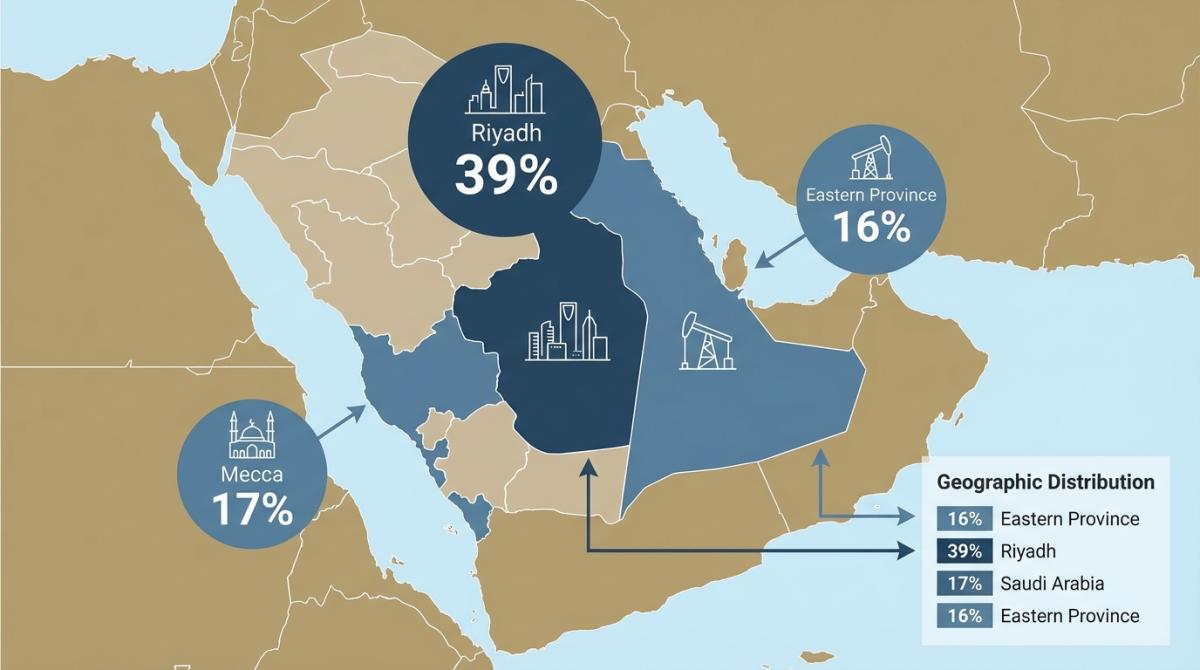 Where are all these businesses? Riyadh has 39% of all registrations. Makes sense β it's the capital, it's where the money is, it's where everyone wants to be right now. Makkah comes in at 17%, Eastern Province at 16%. So if you're specifically looking for a Riyadh business directory, that's your goldmine right there. Almost four out of ten Saudi businesses are based there.