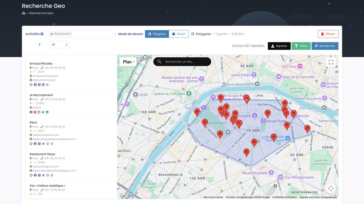 Scrap.io lets you do two things that SerpApi can't even approximate. First: radius search. You pick a point on the map, set a radius — 5km, 10 miles, whatever — and the tool grabs every matching business inside that circle. Second: polygon selection. You draw a custom shape. Literally draw it. Around a neighborhood, a commercial district, a specific block. Only businesses inside your shape get extracted.
