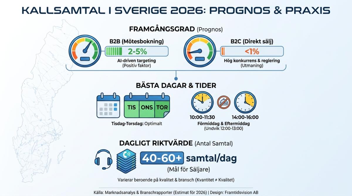 Enligt Cognism (2026) är tisdag och torsdag de mest effektiva dagarna, med toppresultat mellan 16:00–17:00. Undvik måndag morgon och fredag eftermiddag.